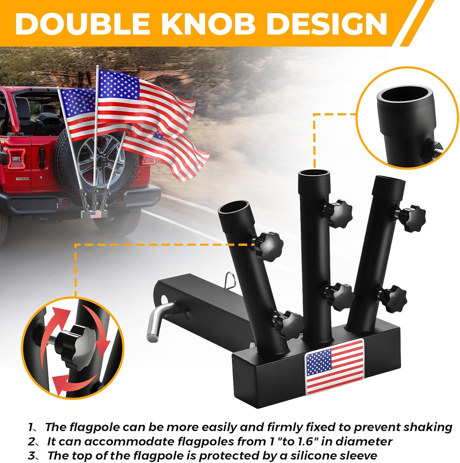 Heavy Duty Three Hitch Flag Holder, Trailer Hitch Flag Pole Holder, Fits 2" Trailer Receivers, Universal Hitch Flag Pole Holder Kit with Cars, Trucks, SUV, Pickups, Campers & Trailers
