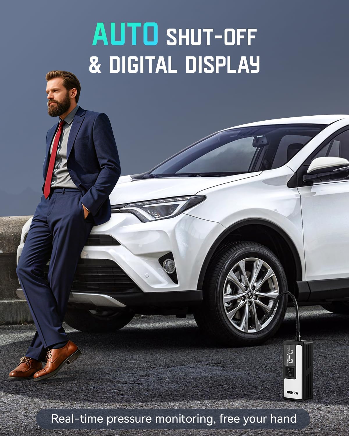 - [Auto Shut-off Free Your Hands]: This portable air compressor features real-time pressure monitoring and auto shut-off. No more manual monitoring or wasted time, just set your pressure level and focus on the task at hand. When you're inflating tires, the auto shut-off function ensures safety, efficiency, and convenience. Free your hands and work smarter