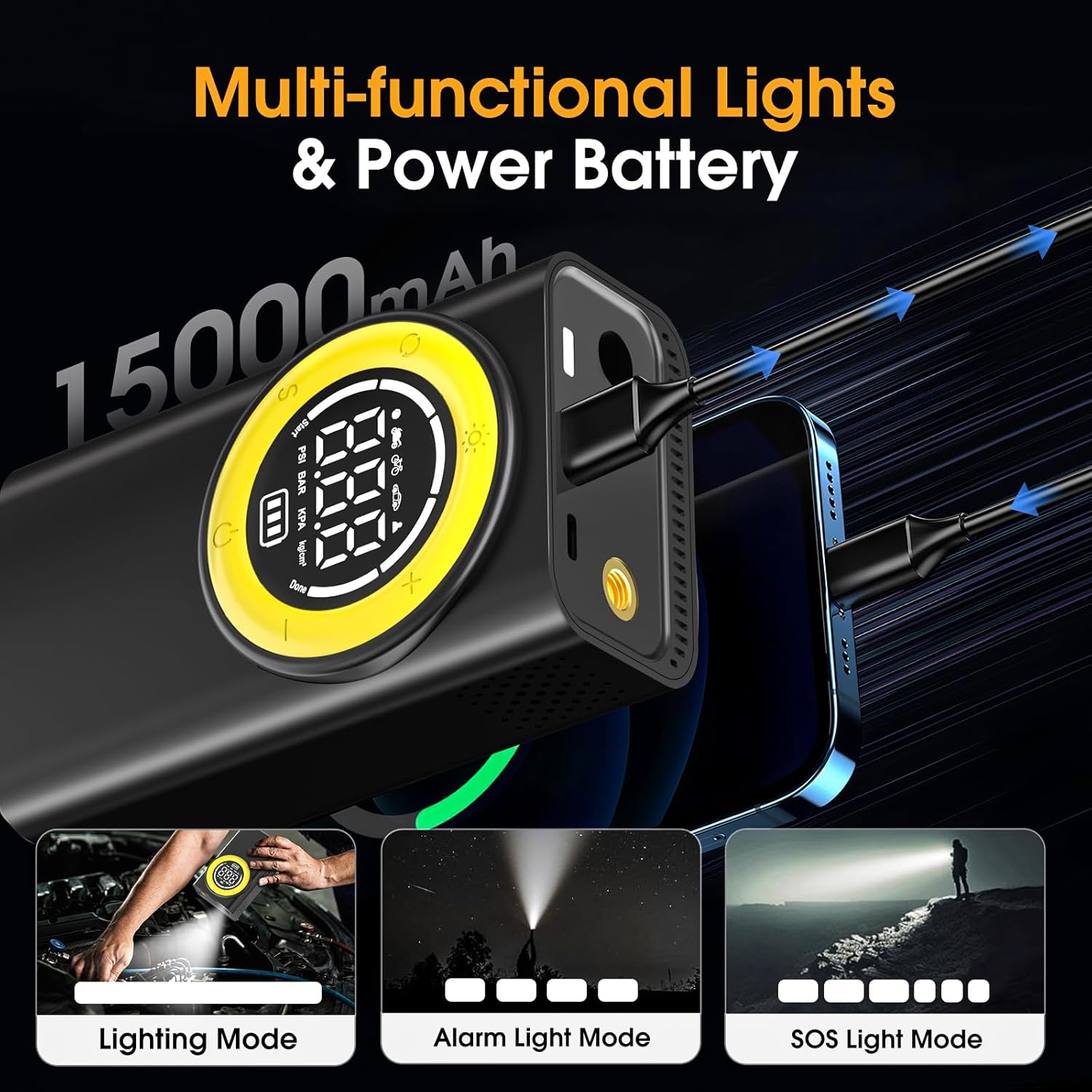 - 【Smart Preset & Auto-Stop】Set your desired pressure (PSI/BAR/KPA) via the liquid crystal display and let the cordless tire inflator work hands-free. Its AI-powered sensor auto-shuts off at the preset PSI (±1.5 accuracy) to prevent overinflation. Includes motor overheating protection for safe & reliable operation