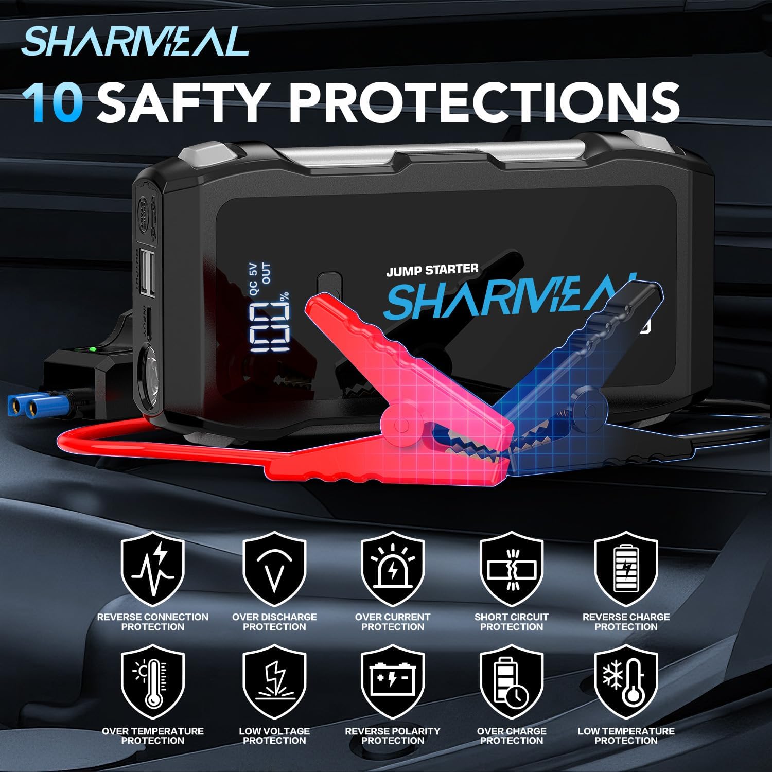 - 【Start Dead Batteries】The Sharmeal car battery jump starter power pack with 3000A peak, safely start the 12V vehicles in seconds with this booster(up to 9.0L gasoline/7.0L diesel engines). It is suitable for cars, trucks, motorcycles, tractors, snowmobiles, etc.
