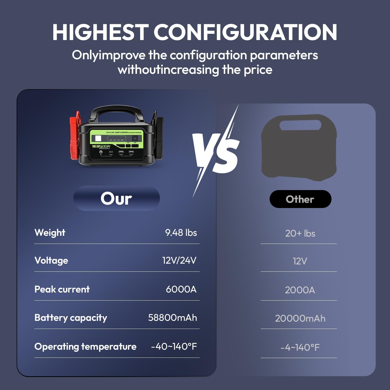 YESPER 6000A Jump Starter with 145W Quick Charge, 12V/24V Heavy Duty Truck Battery Jumper Box(Up to All Gas/Diesel), 218Wh Portable Power Bank Car Jump Pack with Jump Cable, LED Lights