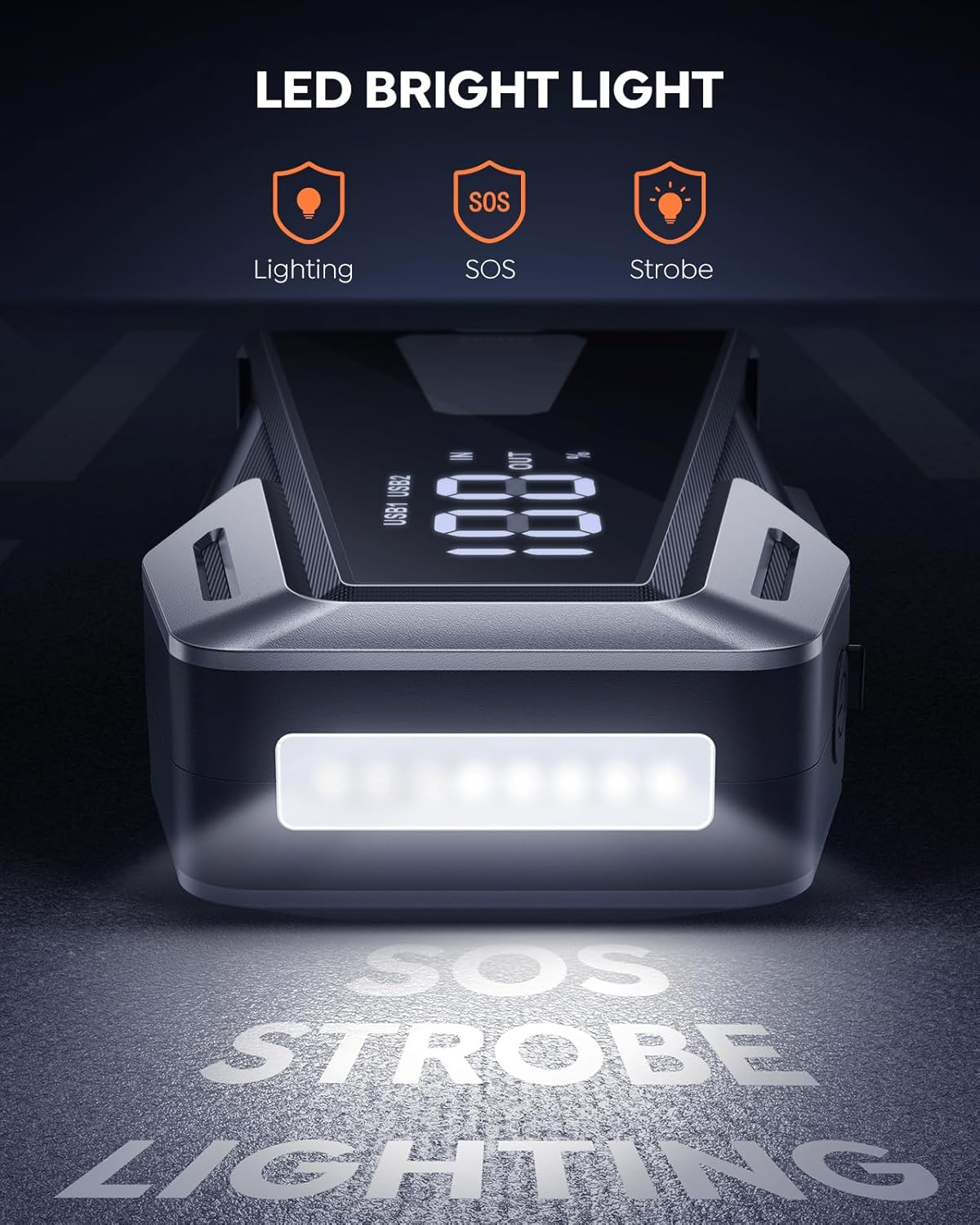 - 【High Efficient Battery Jump Starter】The portable jump starter with latest QDSP technology has 3-5 times the current of the same capacity old jump starter. Boosted 6000A jump starter battery pack can instantly restart 12V dead vehicles (8.5 Gas/8.0L Diesel) in seconds even at -20℃~60℃, support more than 1000+ recharge cycles. Easier than from another car or roadside service.